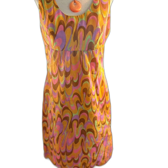 Beautiful vintage 60s Wibor Modelle dress - a vibrant, multi-coloured, abstract pattern sleeveless shift midi dress with empire waist and a zipper back. Excellent condition.