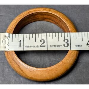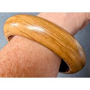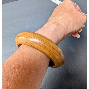This Vtg Wide Maple Wood Bangle Bracelet features a chunky and polished design, perfect for making a statement. Handmade with a round shape and a tan color, this bangle bracelet is ideal for various occasions such as Mother's Day, Christmas, anniversaries, and birthdays. The wooden material adds a touch of nature and beauty to the bohemian-themed piece, making it a unique and original accessory for women looking to add a vintage flair to their ensemble. NOTE: GLOSSY FINISH SHOWS SOME ORANGE TINT IN PLACES, GENTLY USED, GOOD CONDITION.