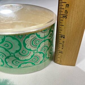 Beautiful container: crown logo on top of lid, paisley/shell/fan pattern in teal, metallic mint green, ivory