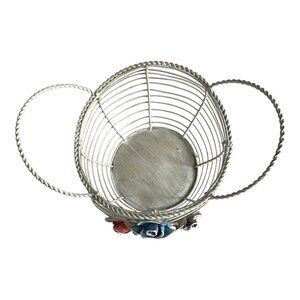 Charming vintage wire basket featuring twisted handles and three hand-painted ceramic roses in red, blue, and purple with green leaves. Perfect for cottage décor, farmhouse displays, or as a decorative catchall.