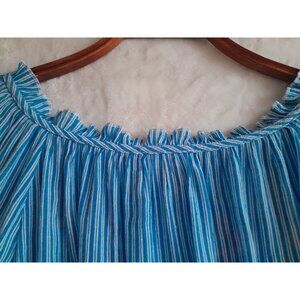 Blue and white striped, decorative ties on the flared sleeves and neckline, floral embroidery on the front bodice, ruffle detail on the flared sleeves
