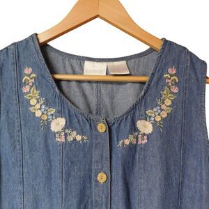 Vtg Womens Denim Long Dress Back Tie Blue Sleeveless Modest Sz Large Embroider