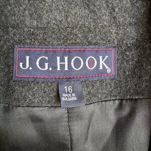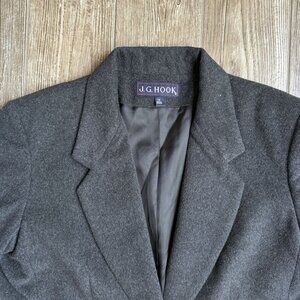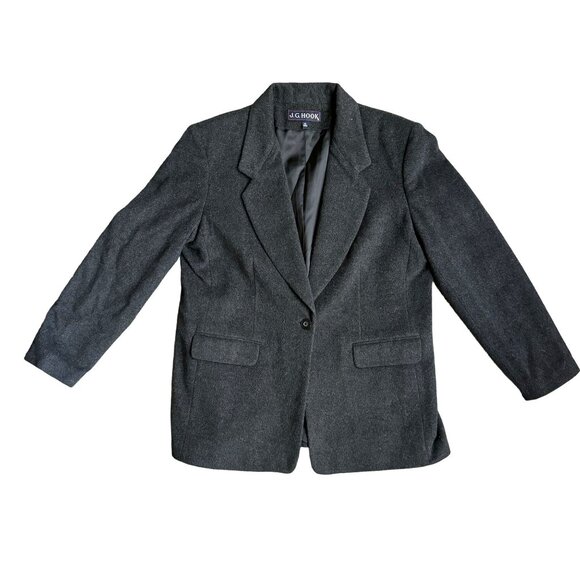 The J.G. Hook Women's Blazer is an exquisite piece crafted from a premium wool blend, ensuring both comfort and style. The charcoal gray color provides a versatile and timeless look, making it an essential addition to any wardrobe. With a single-button closure and fully lined interior, this jacket offers both elegance and practicality.