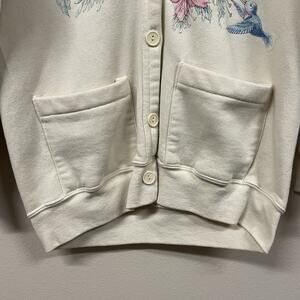 This vintage Wons Wear sweater is a made-in-USA, hand-knit pullover with a V-neckline and embroidered hummingbird and morning glory design, perfect for casual occasions in the winter, fall, or spring seasons. The sweater, in size M, features a tight-knit cotton blend fabric in a solid beige color with a bird theme, making it a unique and charming addition to any wardrobe. With a touch of grandma style and a comfortable fit, this sweater is a delightful choice for those looking for a cozy and whimsical piece of clothing.