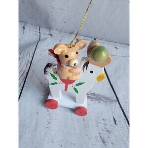 Vtg Wood Christmas Ornament Bear Balloon on Reindeer Toy 4" Decoration