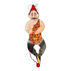 This vintage wooden jumping jack pull string toy features a circus strong man character with a mom tattoo and curly chest hair, making it a charming ornament or collectible. The pull string mechanism allows the toy to "jump" when pulled, providing interactive play and decorative appeal for enthusiasts of vintage and antique toys.