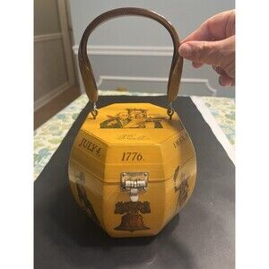 Vtg Wooden Box Purse Octagon Lucite Handle Declaration of the Independence