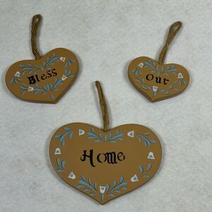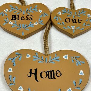 Vtg Wooden Heart Plaques "Bless Our Home" Rope Hanging Country Decor Cottagecore
