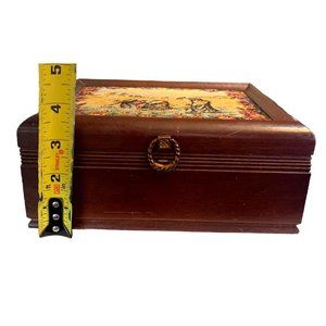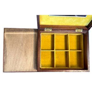 Vtg Wooden Jewelry Box Tapestry Top Yellow Velvet Lining Tray Mirror