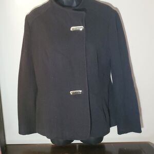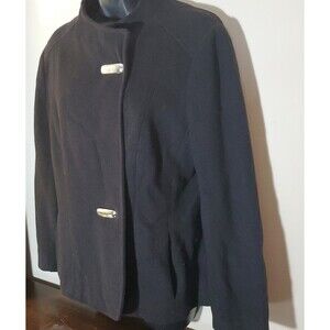 The jacket is black in color and has accents of buckle and strap that add to its overall design. It is a lightweight jacket that is ideal for wearing during the fall and spring seasons. The jacket is single-breasted and lined, ensuring maximum comfort and warmth while wearing. This blazer jacket is a perfect choice for any fashion-forward woman who wants to add a classic and stylish piece to her wardrobe.