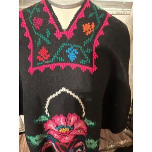 Vtg Wool Mexican Embroidered Poncho Floral Cross-Stitch Fringe Boho Hippie O/S