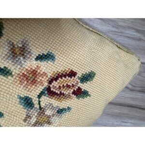 This vintage needlepoint floral throw pillow features intricate floral designs, adding a touch of elegance to any space. Crafted with precision and attention to detail, it serves as a classic decorative accessory. The blend of colors and textures creates a timeless aesthetic, making it a sophisticated choice for enhancing home decor.