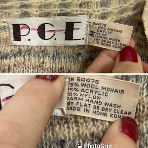Vintage P.G.E. Womens Cardigan Sweater Size Medium Wool Mohair Blend Structured with shoulder pads you could remove if they bother you. Pleat on shoulder helps with the pads structure. Waffle Square Weave. Mid length with pockets. Made in Hong Kong. Measurements in photos. Comes from a smoke free environment. Very good pre-owned condition. No rips, holes, or stains. Yarn has a blend of colors in it mostly cream ivory oatmeal gray brown tones.