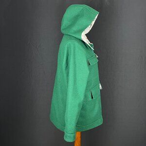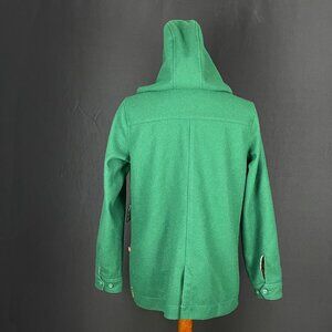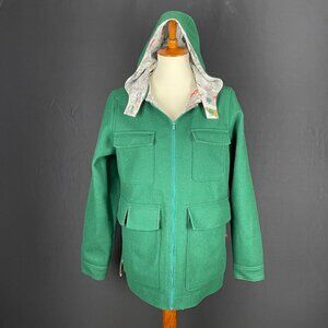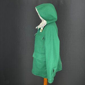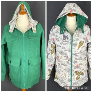 Vintage Woolrich reversible jacket in size medium. Hunter green with novelty print of pheasants, deer, and outdoor hunting scenes on the reverse. Featuring a removable hood and multiple pockets on both sides. Made in China of 85% wool 15% nylon (green) and 100% nylon (printed). Jacket is semi lightweight with no insulation. Measures 21" armpit to armpit, 26.5" neck to tail, 24" sleeve. Excellent condition with no holes, tears, stains, or ripped seams. Smoke free, pet friendly home.