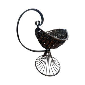 Bring timeless design into your home with this vintage mid-century modern woven rattan basket on an elegant wrought iron pedestal stand. Featuring a sculptural swirl handle and beautifully hand-woven rattan body, this piece is both functional and decorative. Perfect as a fruit bowl, centerpiece, or display basket, it adds a warm organic texture and retro charm to any space.