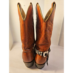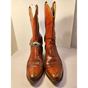 These vintage Wrangler brown leather cowboy boots with a silver anklet are perfect for a western cowgirl style. They feature a mid-calf shaft, pointed toe, pull-on closure, and a 1.5-inch block heel. The brown leather upper and lining, along with the leather insole, provide comfort and durability for casual occasions in the winter, fall, or spring seasons. The western and cowboy theme adds a touch of personality to any outfit, making these boots a must-have for any woman looking to channel her inner cowgirl. Please look at all the photos as they are part of the description. Please email with any questions.