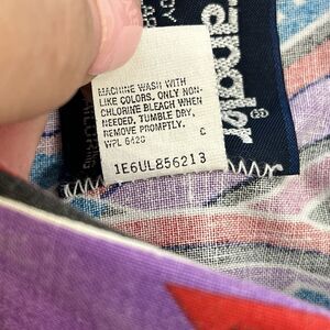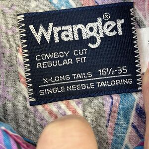 This vintage Wrangler shirt in size 16.5 features a unique purple Aztec pattern, perfect for a cowboy or western-themed outfit. Made of cotton fabric, this long-sleeve button-up shirt has a spread collar and a regular fit, suitable for travel, casual wear, or work. With a retro 70s and 80s vibe, this colorful shirt with a tribal design is machine washable and has a single stitch product line, adding to its appeal for those interested in a stylish yet practical piece of clothing.