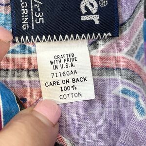 This vintage Wrangler shirt in size 16.5 features a unique purple Aztec pattern, perfect for a cowboy or western-themed outfit. Made of cotton fabric, this long-sleeve button-up shirt has a spread collar and a regular fit, suitable for travel, casual wear, or work. With a retro 70s and 80s vibe, this colorful shirt with a tribal design is machine washable and has a single stitch product line, adding to its appeal for those interested in a stylish yet practical piece of clothing.