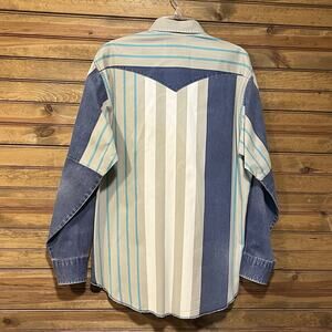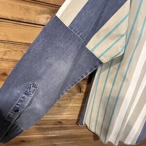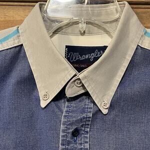 Pre-loved in great condition for age. Shows some fading along seams and elbows. Tiny hole at edge of hem beneath button area - shown in photos. Heavier weighted material - unique blue, tan and striped denim color block design. Button down collar points. X-long tails. Left front chest pocket has opening for pen. Adjustable button cuffs. Spare buttons for shirt and collar still attached. Wrangler label in angled cursive rope design. Made in the USA!