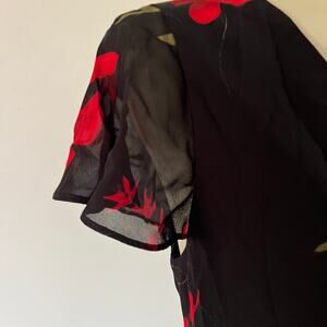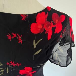 features sheer flutter sleeve, floral detail, and asymmetrical skirt.