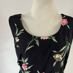 Features pullover design, zips up the back, black background with flowers, tank sleeves, and a high neckline.
