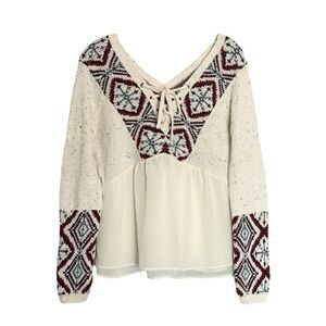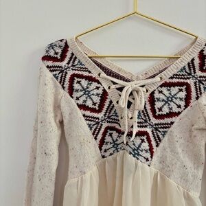 Cutie vintage early 2000s Abercrombie peplum top. The top half of the blouse features a lace up style sweater with fair isle print. Bottom half is a flowy cream chiffon. Cherry red / oxblood & cream color combo