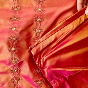 Features: Metallic iridescent orange and pink color, shot silk color change fabric, mirror and threading embellishments at the hem on both sides, hot pink lined, two side slits, zipper back