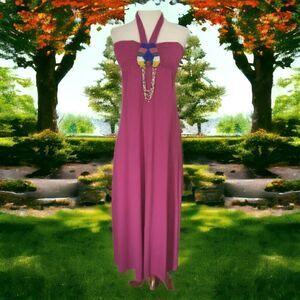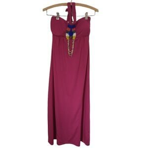 Vtg Y2K Beaded Halter Dress Maxi Sundress Small Pink Bohemian Beachy Gypsy Sexy