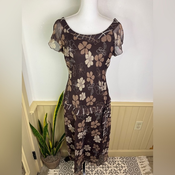 Earthy, whimsical Y2K chiffon dress in chocolate brown with taupe florals. Scoop neckline with contrast plaid trim, sheer flutter sleeves, drop waist with bow, and tiered/ruffled skirt. Fully lined polyester; lightweight and twirly.