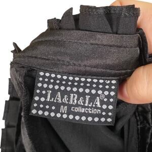 This is a true vintage Y2K dress by the brand LA&B&LA. Dress features a zip closure up the side, button at the back of neck (small keyhole) and pleated ruffle around the neck. Neck has a bow detail and cascading ruffle down the front. Dress has puff style sleeves with ruffle trim and a sheath style fit. Fabric is a black satin with a little bit of stretch. No flaws to note, dress is in excellent condition!