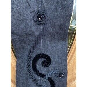 Vintage Y2K size 10 black denim jeans with intricate black swirl velvet embroidery, soft stretch fabric, and flattering flare leg cut.