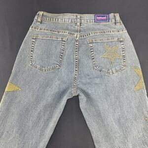 Vtg Y2K Bubblegum Jeans Womens 3/4 Flare Gold Glitter Embroidered Stars Low Rise