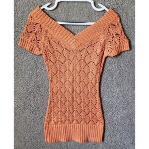 Vtg Y2K Cache Short Sleeve V Neck Open Knit Long Sweater Top Orange Metallic XS
