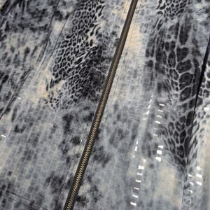 Blue, white, and black leopard print full zip mock neck track jacket with an allover clear sequin overlay, from ELCC.
