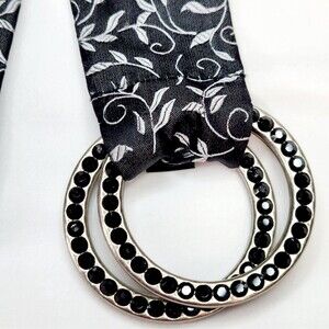 Vtg Y2K Express Womens Belt Sz Sm 34" 100% Silk Black Silver Rhinestone Buckle