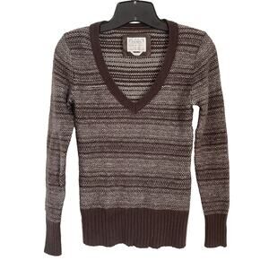 Throwback Y2K vibes with this fitted deep V-neck sweater in brown and cream stripes. Authentic Y2K piece - Old Navy 2007 Holiday season. Features ribbed hem and cuffs with a flattering slim fit that channels the iconic Bella Swan / early 2000s teen drama aesthetic. Cozy wool/angora/nylon blend makes it soft and warm with just the right amount of stretch.