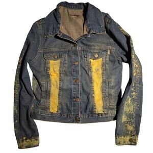Vtg Y2K Formula Blue Yellow Distressed Paint Splatter Cotton Denim Jacket 40 8