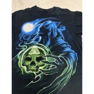 Vtg Y2K Grim Reaper Skull Gothic Illuminate Black Graphic T-Shirt Size Medium