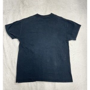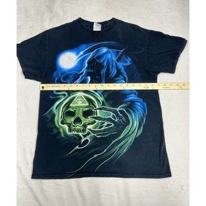 Vtg Y2K Grim Reaper Skull Gothic Illuminate Black Graphic T-Shirt Size Medium. Cracking throughout the graphic, small hole in the left arm pit. Please see pictures for condition and measurements for proper sizing and fit.