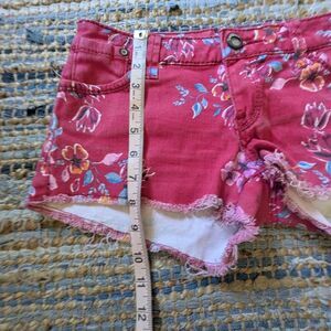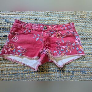 Adorable vintage denim shorts by Hot Kiss in a bold raspberry pink floral print with raw-edge frayed hems labeled size 5, low rise, and a fitted cutoff silhouette classic 2000s Y2K vibe perfect for festivals, summer concerts, or everyday warm weather looks