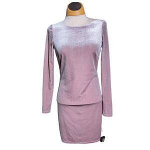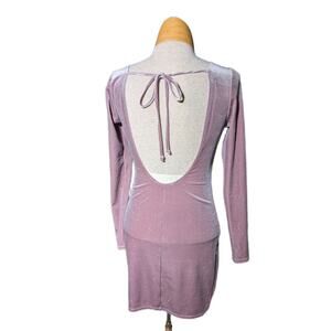 Pink velvet long sleeve bodycon mini dress with allover silver metallic swirls, and an open back with tie closure, from Jump Apparel.