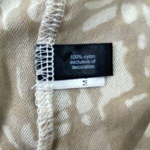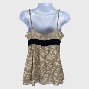 - Color/Pattern: tan and cream abstract geometric print with black waist detail