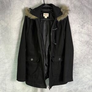 A stylish and cozy black wool blend coat from Mossimo Supply Co. featuring a faux fur trimmed hood. This coat boasts a classic toggle button closure, offering both functionality and a touch of timeless style. With its warm wool blend construction and a comfortable lining, it is perfect for colder weather. The coat also features functional pockets, adding practicality to its fashionable design. Suitable for everyday wear, weekend outings, or casual evenings.