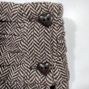 This vintage Y2K Old Navy midi skirt in size 10 features a herringbone pattern in a brown wool blend material, with ruched detailing, lace accents, and a button closure. The A-line skirt is perfect for various occasions such as travel, parties, casual outings, and business meetings. Its retro 90s preppy style makes it versatile for wearing in the fall, winter, and spring seasons, adding a touch of nostalgia to any wardrobe.