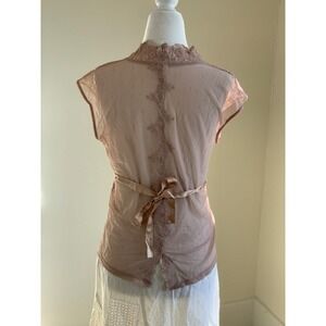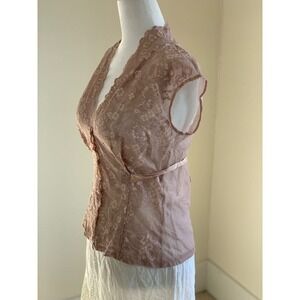 Precious vintage Only Hearts by Helena Stuart button front cap sleeve lace top. Mauve beige lace body, bust is darted, with satin trimmed buttons and a satin tie back.