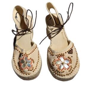 Vtg Y2K Roxy Ivory Canvas Beaded Shell Embellished Espadrille Sandals Sz 7