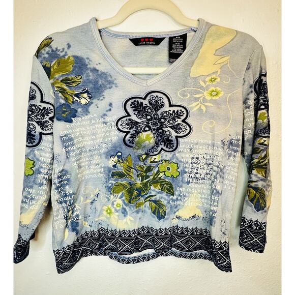 Vtg Y2K Three Hearts Blue Floral Whimsy Cottage Blouse Size Medium