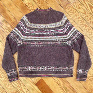 Vintage Y2K Tiara International women’s full zip sweater in a cozy brown base with classic Nordic Fair Isle knit detailing in cream, pink, mustard, and olive tones. Features ribbed cuffs and hem, soft medium-weight knit fabric, and a relaxed fit — perfect for layering in fall and winter.