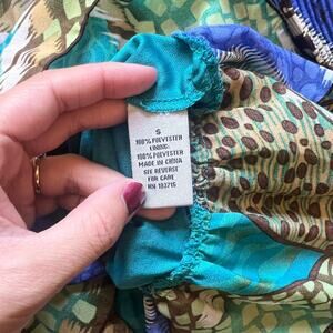 Vintage Y2K Signature by Larry Levine Womens Top Size S Blue Multi-color Leopard Abstract Groovy Trumpet Sleeve Ruffled Stretch Fairy Boho Artsy Hippie