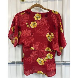 Vtg Y2K Tropical Womens Wrap Top Small red Yellow Floral Sheer Fairy Boho Resort